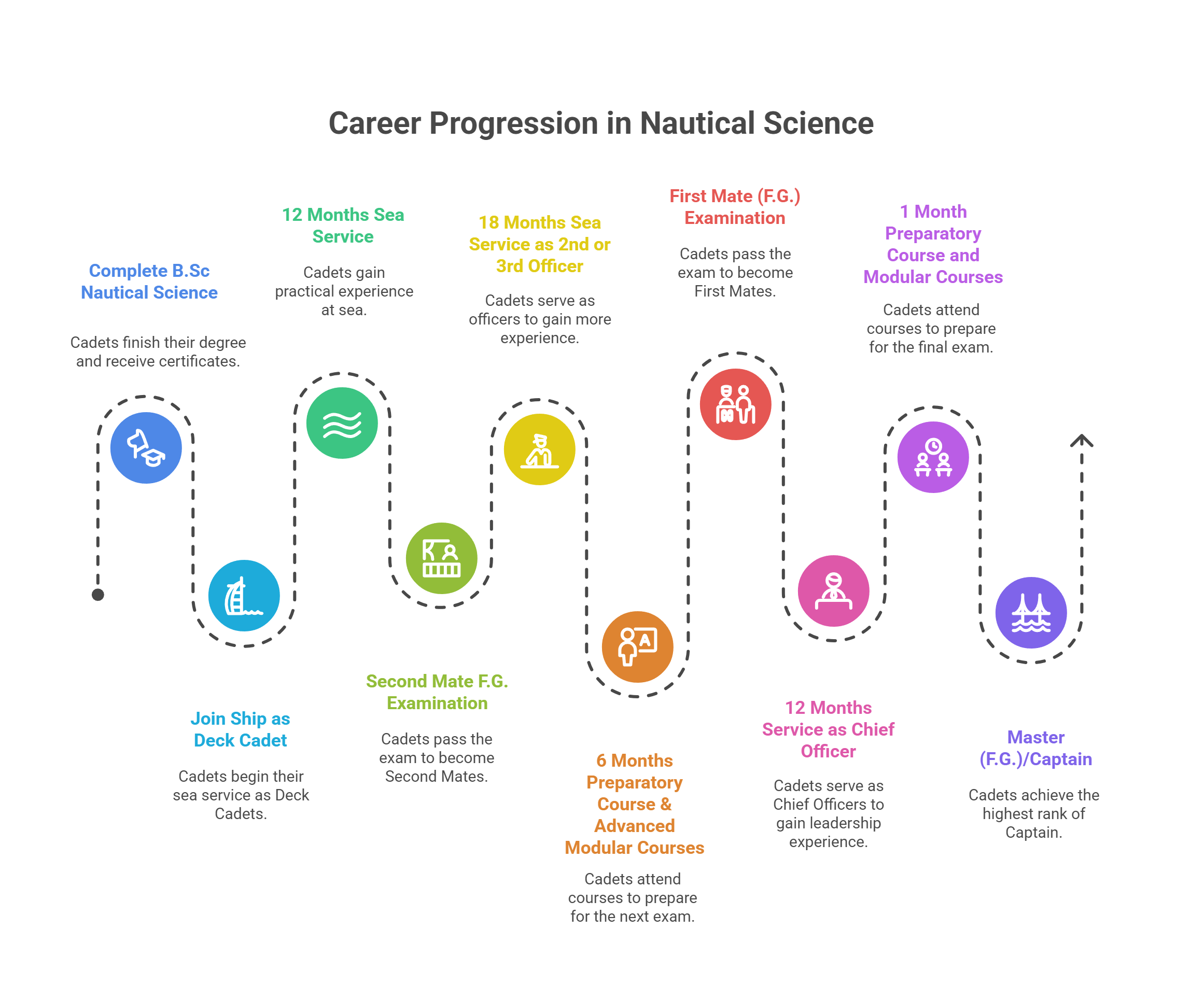 Eligible to join as Deck Cadet on Merchant Navy ships. After required sea time and further certifications (2nd Mate, Chief Mate, etc.), graduates can rise to the prestigious position of Captain of the Ship.